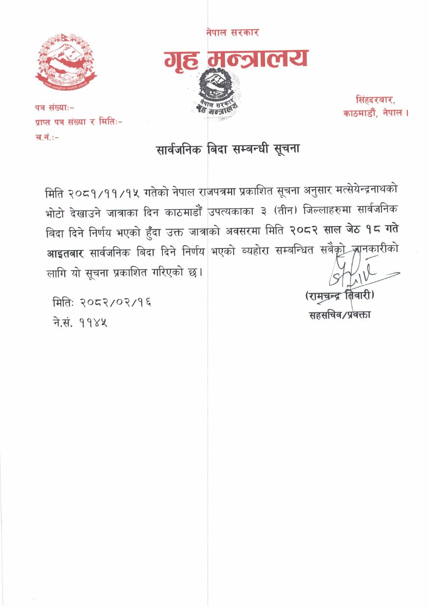 उक्त दिन सरकारी कार्यालय, बीमा कम्पनी, बैंक तथा शेयर बजार पनि बन्द रहनेछन् ।