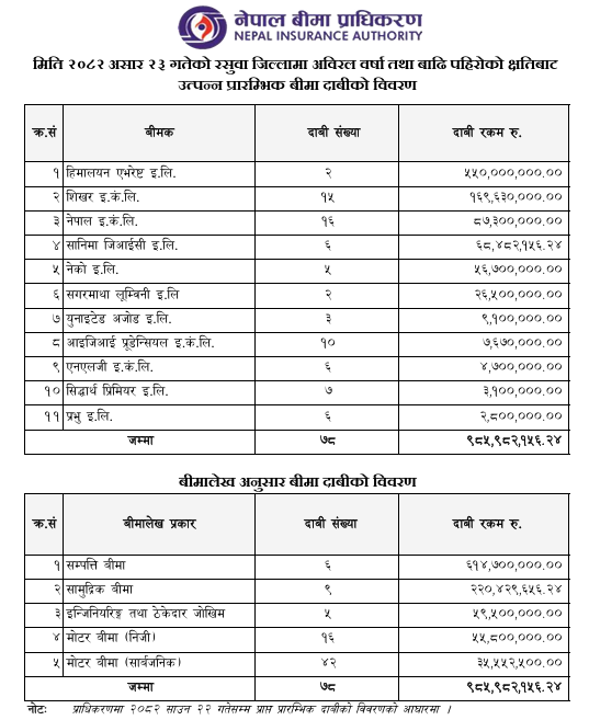 प्राधिकरणका अनुसार साउन २२ गतेसम्म ११ वटा निर्जीवन बीमकबाट प्राप्त विवरणअनुसार कुल ७८ वटा बीमा दाबीमा ९८ करोड ५९ लाख रुपैयाँ क्षतिपूर्ति माग भएको छ।