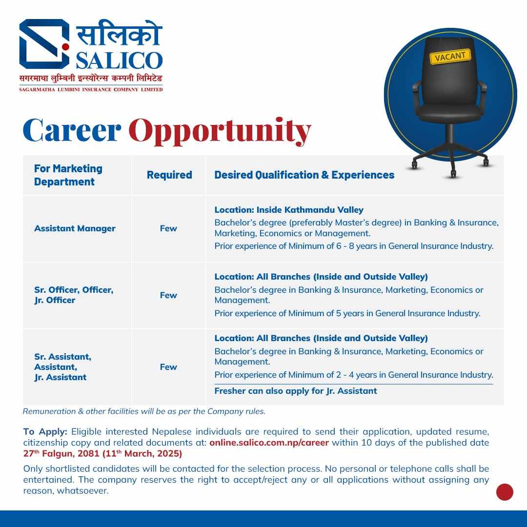 काठमाडौं । सगरमाथा लुम्बिनी इन्स्योरेन्स कम्पनीले विभिन्न पदका लागि कर्मचारी माग गरेको छ । कम्पनीले मार्केटिङ डिपार्टमेन्टमा असिस्टेन्ट म्यानेजरका लागि केही, सिनियर अफिसर, अफिसर र जूनियुर अफिसरका लागि केही, सिनियर असिस्टेन्ट, असिस्टेन्ट र जूनियर असिस्टेन्टका लागि केही संख्यामा कर्मचारी माग गरेको हो । कम्पनीले आफ्नो केन्द्रीय कार्यालय तथा विभिन्न शाखा उपशाखाका लागि कर्मचारी माग गरेको हो । ईच्छुक तथा योग्यता पुगेकाले आज फागुन २७ गतेको मितिले १० भित्र आवेदन दिनुपर्नेछ ।