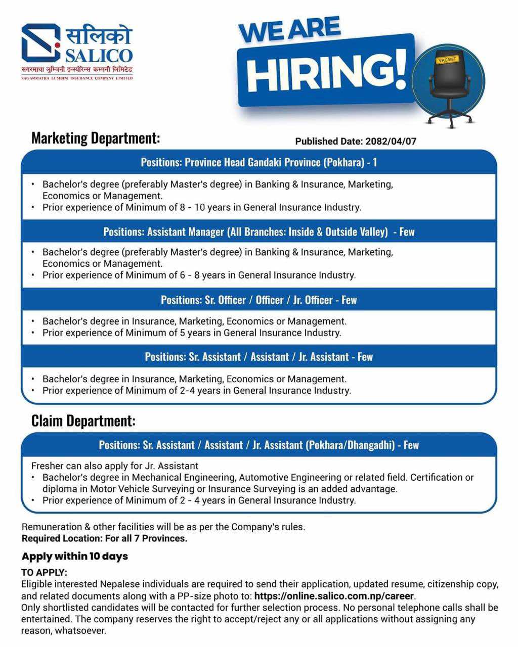 साथै, कम्पनीले क्लेम डिपार्टमेन्टमा सिनियर असिस्टेन्ट, असिस्टेन्ट र जूनियर असिस्टेन्टका लागि पोखरा र धनगढीका लागि केही संख्यामा कर्मचारी माग गरेको हो । ईच्छुक तथा योग्यता पुगेकाले सूचना प्रकाशित भएको मितिले १० दिनभत्रि आवेदन दिनुपर्नेछ ।