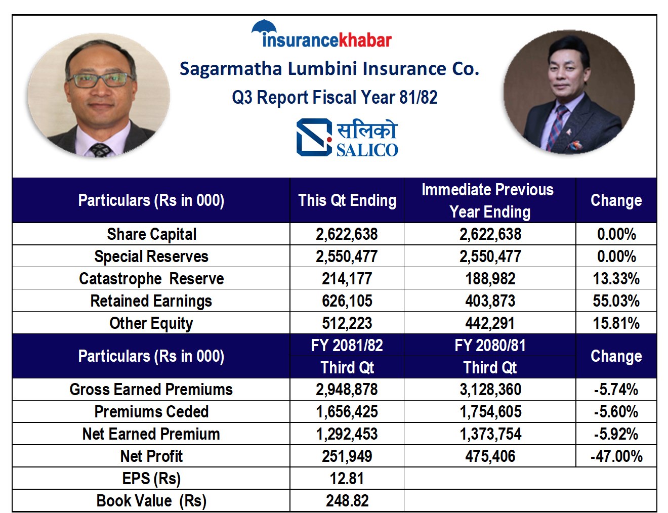 काठमाडौं । सगरमाथा लुम्बिनी इन्स्योरेन्सले चालु आर्थिक वर्षको तेस्रो त्रैमाससम्मको अपरिष्कृत वित्तीय विवरण सार्वजनिक गरेको छ । वित्तीय विवरणअनुसार कम्पनीको अधिकांश सूचक घटेको छ ।