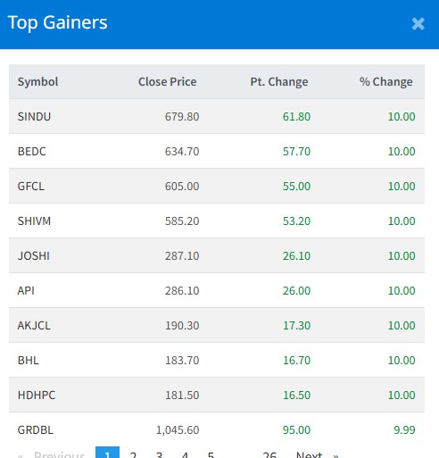 काठमाडौं । आज नेप्से १११ अंकले बढेर २,६२३ को विन्दुमा कायम भएको छ । आज सबैभन्दा धेरै ९ कम्पनीका लगानीकर्ताले कमाएका छन् । आज सिन्धु विकास बैंक, भुगोल इनर्जी, गुडविल फइनान्स, शिवम् सिमेन्ट, जोशी हाइड्रोपावर, अपि पावर कम्पनी, आँखु खोला जलविद्युत कम्पनी, बलेफि हाइड्रोपावर र हिमाल दोलखाका लगानीकर्ताले १० प्रतिशतका दरले कमाएका छन् ।