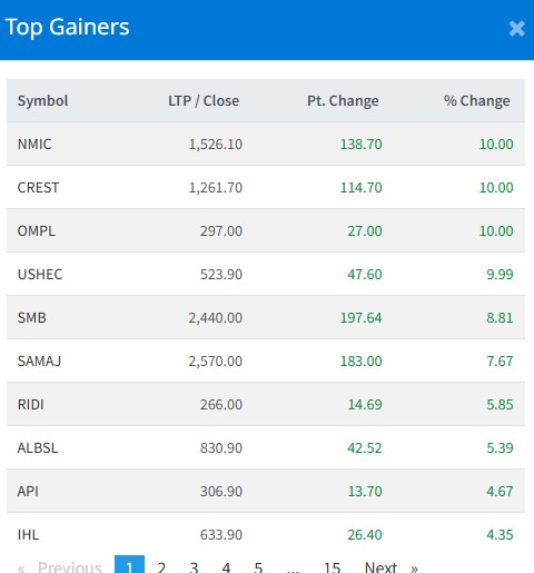 आज सबैभन्दा धेरै नेपाल माइक्रो इनस्योरेन्स, क्रेष्ट माइक्रो लाइफ र ओम मेगा श्रीका लगानीकर्ताले कमाएका छन् । आज यी ३ कम्पनीका लगानीकर्ताले १० प्रतिशतका दरले कमाएका हुन् । अपर सोलु हाइड्रोका लगानीकर्ताले ९ दशलमव ९९ प्रतिशतका दरले कमाएका हुन् ।