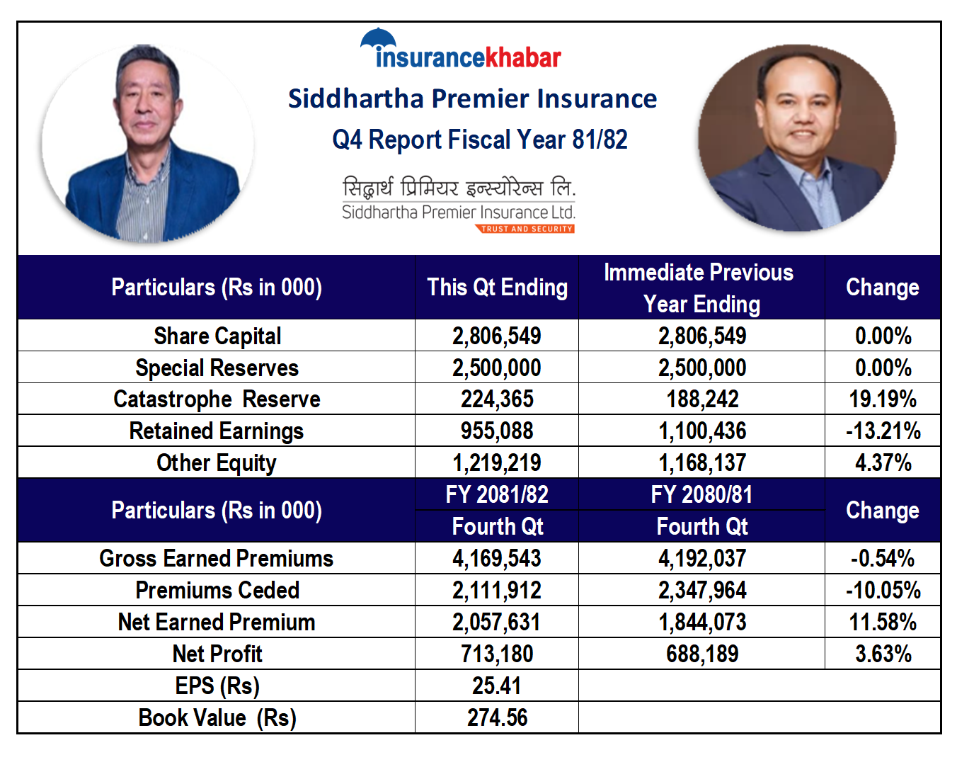 काठमाडौं । सिद्धार्थ प्रिमियर इन्स्योरेन्सले गत आर्थिक वर्ष २०८१।८२ को चौथो त्रैमाससम्मको अपरिष्कृत वित्तीय विवरण सार्वजनिक गरेको छ। वित्तीय विवरणअनुसार कम्पनीले समीक्षा वर्षमा ७१ करोड ३१ लाख रुपैयाँ नाफा आर्जन गरेको छ। अघिल्लो आर्थिक वर्ष २०८०।८१ मा कम्पनीले ६८ करोड ८१ लाख रुपैयाँ नाफा आर्जन गरेको थियो। अघिल्लो आर्थिक वर्षको तुलनामा समीक्षा वर्षमा कम्पनीको नाफा ३.६३ प्रतिशतले बढेको छ।