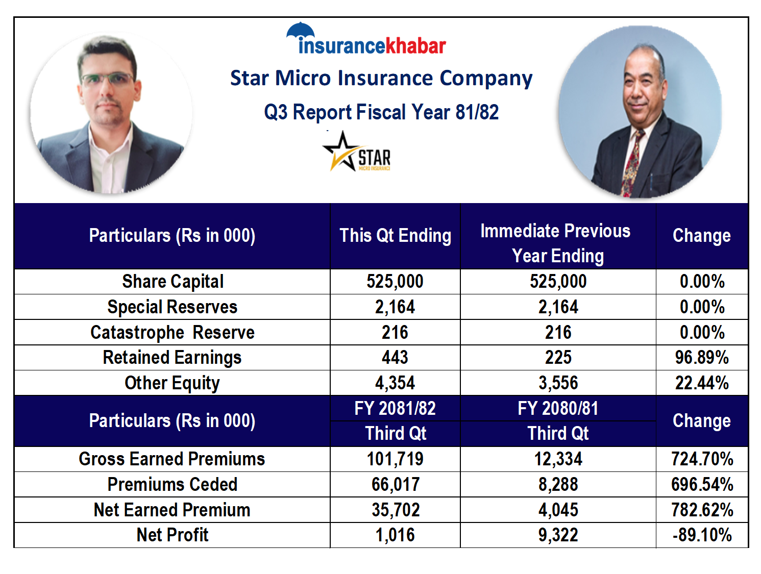 काठमाडौं । स्टार माइक्रो इन्स्योरेन्सले आर्थिक वर्ष २०८१ /८२ को तेस्रो त्रैमासको अपरिष्कृत वित्तीय विवरण प्रकाशन गरेको छ । कम्पनीले प्रकाशन गरेको वित्तीय विवरण अनुसार खुद नाफा घटेको छ ।