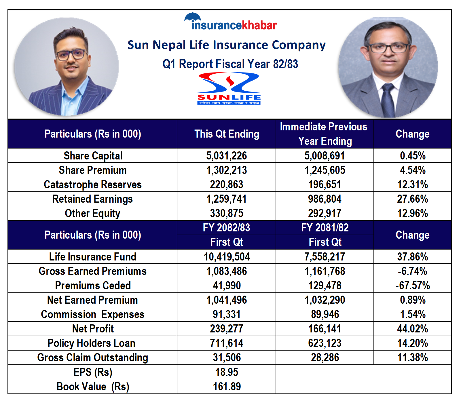 शेयरपुँजी ५ अर्ब ३ करोड १२ लाख रुपैयाँ रहेको कम्पनीको वार्षिकीकृत प्रतिशेयर आम्दानी (ईपीएस) बढेर १८.९५ रुपैयाँ कायम भएको छ। अघिल्लो वर्ष ईपीएस १६.७८ रुपैयाँ थियो। पीई रेसियो २२.५६ गुणा रहेको कम्पनीको प्रतिशेयर नेटवर्थ १६१.८९ रुपैयाँ रहेको छ।