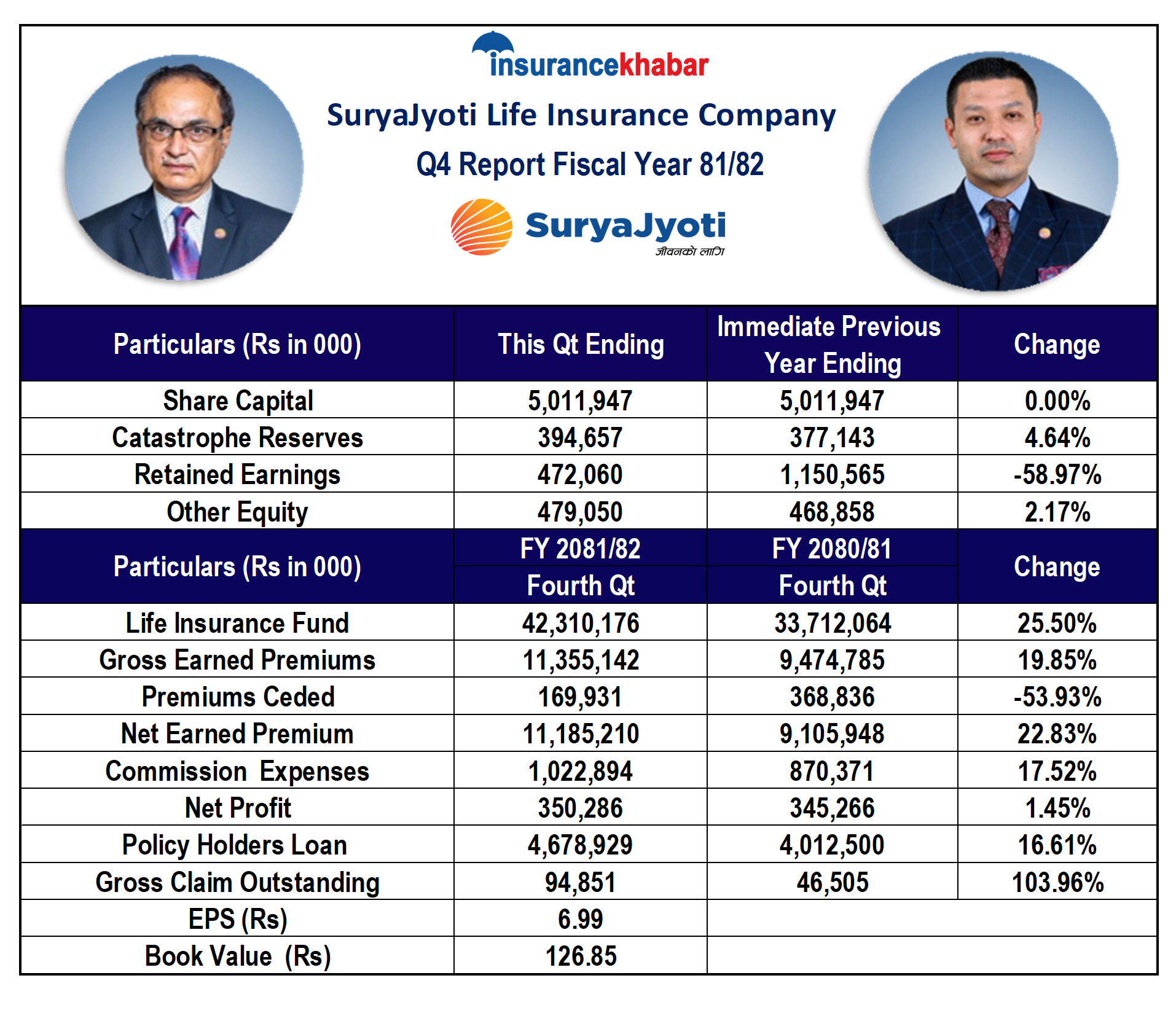 वित्तीय विवरणअनुसार समीक्षा वर्षमा सूर्यज्योति लाइफले ३५ करोड २ लाख रुपैयाँ नाफा आर्जन गर्न सफल भएको छ। अघिल्लो आर्थिक वर्ष २०८०।८१मा कम्पनीले ३४ करोड ५२ लाख रुपैयाँ नाफा आर्जन गरेको थियो। अघिल्लो आर्थिक वर्षको तुलनामा समीक्षा वर्षमा कम्पनीको नाफा १.४५ प्रतिशतले बढेको छ।