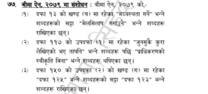 दफा १३ को खण्ड च मा रहेको ‘मध्यस्थता’ गर्ने भन्ने शब्दको सट्टा ‘मेलमिलाप’ गराउने’ शब्दहरू राखिएको छ। नेपाल बीमा प्राधिकरणका अध्यक्षको काम, कर्तव्य र अधिकार समेटिएको यो दफाको खण्ड (च) मा बीमक र बीमित बीचको विवादमा ‘मध्यस्थता’ गर्ने शब्द हटाएर अब ‘मेलमिलाप’ गराउने’ शब्द हुने भएको छ।