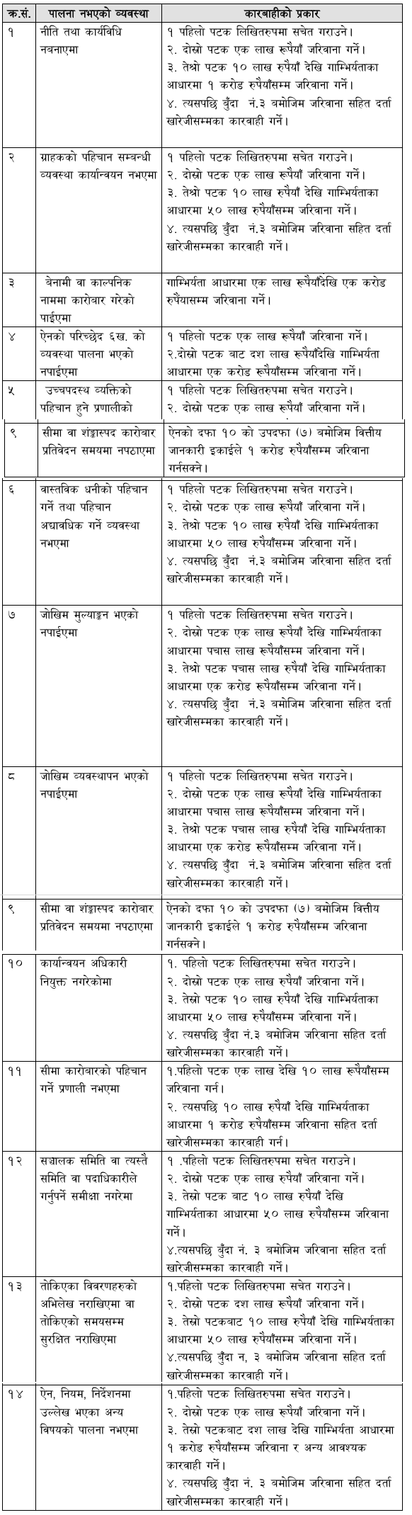 विभागका अनुसार ऐन, नियमावली र निर्देशिकामा भएका व्यवस्था कार्यान्वयन नगर्ने व्यवसायीलाई पहिलोपटक लिखित रुपमा सचेत गराइनेछ। त्यसपछि पनि नियम पालना नगरेमा दोस्रोपटक १ लाख रुपैयाँ, तेस्रोपटक १० लाख रुपैयाँदेखि १ करोड रुपैयाँसम्म र चौथोपटक १० लाख रुपैयाँदेखि १ करोडसम्मको जरिवानासहित संस्थाको दर्ता खारेजी गरिनेछ।