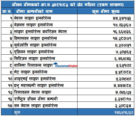 यस अवधिमा सबैभन्दा धेरै नेपाल लाइफ इन्स्योरेन्स कम्पनीले कुल बीमाशुल्क संकलन गरेको छ । कम्पनीले यस अवधिमा ४ अर्ब ४३ करोड रुपैयाँ कुल बीमाशुल्क संकलन गरेको छ । दोस्रोमा नेशनल लाइफ रहेको छ । कम्पनीले यस अवधिमा १ अर्ब ७० करोड रुपैयाँ कुल बीमाशुल्क संकलन गरेको छ । तेस्रोमा एलआइसी नेपाल रहेको छ । कम्पनीले यस अवधिमा १ अर्ब ६६ करोड रुपैयाँ कुल बीमाशुल्क संकलन गरेको छ । हिमालयन लाइफले १ अर्ब ४२ करोड रुपैयाँ कुल बीमाशुल्क संकलन गरेको छ ।