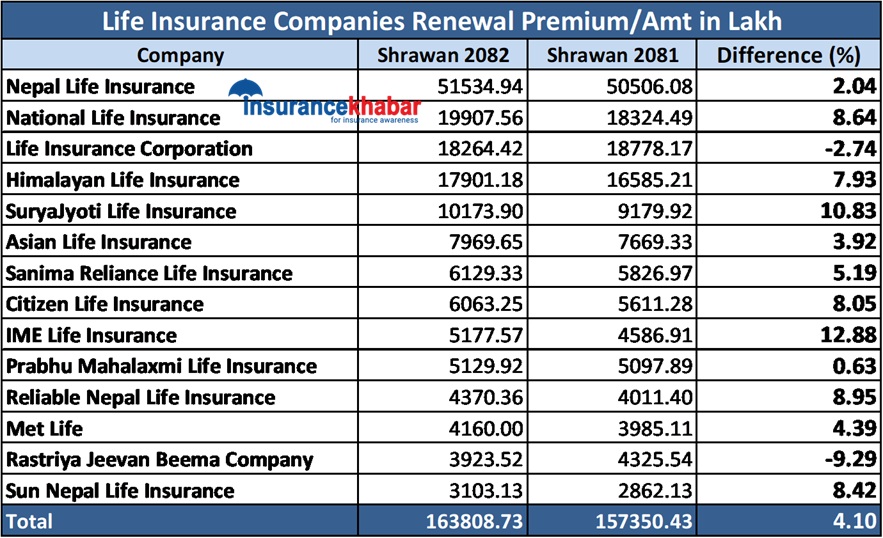 चालु वर्षको साउनमा हिमालयन लाइफले १ अर्ब ७९ करोड १ लाख रुपैयाँ नवीकरण बीमाशुल्क संकलन गर्दा सूर्यज्योति लाइफले १ अर्ब १ करोड ७३ लाख रुपैयाँ, एसियन लाइफले ७९ करोड ६९ लाख रुपैयाँ, सानिमा रिलायन्स लाइफले ६१ करोड २९ लाख रुपैयाँ र सिटिजन्स लाइफले ६० करोड ६३ लाख रुपैयाँ संकलन गरेका छन्। अघिल्लो वर्षको तुलनामा समीक्षा अवधिमा हिमालयन लाइफको ७.९३ प्रतिशत, सूर्यज्योति लाइफको १०.८३ प्रतिशत, एसियन लाइफको ३.९२ प्रतिशत, सानिमा रिलायन्स लाइफको ५.१९ प्रतिशत र सिटिजन लाइफको ८.०५ प्रतिशतले बढेको छ।