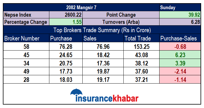 बजारमा ६ अर्ब २८ करोड रुपैयाँको कारोबार भएको दिन ब्रोकर नम्बर ५८ बाट सर्वाधिक रकमको कारोबार भएको छ। यो ब्रोकरबाट १ अर्ब ५३ करोड २५ लाख रुपैयाँको कारोबार भएको छ। जसमा ७६ करोड २८ लाख रुपैयाँको खरिद र ७६ करोड ९६ लाख रुपैयाँको बिक्री छ।