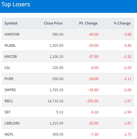 यो दिन हिमस्टार ऊर्जाका शेयरधनीहरुले सर्वाधिक गुमाए। यो कम्पनीको शेयरभाउ ३.८८ प्रतिशतले घटेको छ।
