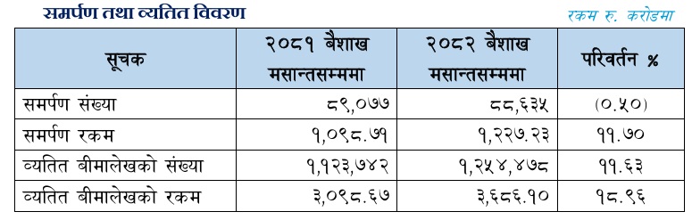 चालु आर्थिक वर्षको वैशाखसम्म कम्पनीहरुमा ८८ हजार ६३५ वटा बीमालेख समर्पण गरिएका छन्। यी बीमालेख समर्पणबाट कम्पनीहरुबाट १२ अर्ब २७ करोड २३ लाख रुपैयाँ बाहिरिएको छ।