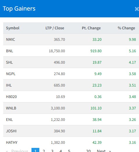काठमाडौं । आज शेयर बजार नेप्से परिसूचक १३ दशलमव ९० अंकले बढेर २,६८० को विन्दुमा कायम भएको छ । आज १५४ कम्पनीको शेयर मूल्य बढेको छ भने ९० कम्पनीको शेयर मूल्य घटेको छ । आज सबैभन्दा धेरै नेपाल माइक्रो इन्स्योरेन्स कम्पनीका लगानीकर्ताले कमाएका छन् । आज यस कम्पनीका लगानीकर्ताले ९ दशलमव ९८ प्रतिशतका दरले कमाएका हुन् । बोटलर्स नेपाल बालाजूका लगानीकर्ताले ५ दशलमव १६ प्रतिशतका दरले कमाएका छन् । सोल्टी होटलका लगानीकर्ताले ४ दशलमव १७ प्रतिशतका दरले कमाएका छन् । ङादी ग्रुप पावरका लगानीकर्ताले ३ प्रतिशतका दरले कमाएका हुन् ।