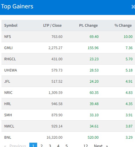 आज सबैभन्दा धेरै नेपाल फाइनान्सका लगानीकर्ताले कमाएका छन् । आज यस कम्पनीका लगानीकर्ताले १० प्रतिशतका दरले कमाएका हुन् । गार्डियन माइक्रो लाइफका लगानीकर्ताले ७ दशमलव ३६ प्रतिशतका दरले कमाएका छन् । राप्ती हाइड्रोका लगानीकर्ताले ५ दशमलव ७० प्रतिशतका दरले कमाएका हुन् ।