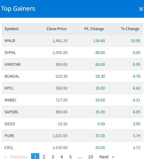 आज सबैभन्दा धेरै विन नेपाल लघुवित्त वित्तीय संस्थाका लगानीकर्ताले कमाएका छन् । आज यस कम्पनकिा लगानीकर्ताले १० प्रतिशतका दरले कमाएका हुन् । एसवाई प्यानलका लगानीकर्ताले ९ दशमलव ०९ प्रतिशतका दरले कमाएका छन् । हिम स्टार ऊर्जाका लगानीकर्ताले ८ प्रतिशतका दरले कमाएका छन् ।