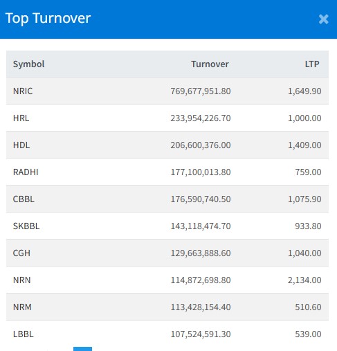 आज ५ अर्ब ७५ करोड माथिको शेयर कारोबार हुँदा सबैभन्दा धेरै नेपाल पुनर्बीमा कम्पनीको शेयर कारोबार भएको छ । आज यस कम्पनीको ७६ करोड ९६ लाख रुपैयाँको शेयर कारोबार भएको छ । हिमालयन रिइन्स्योरेन्सको २३ करोड ३९ लाख रुपैयाँको शेयर कारोबार भएको छ । हिमालयन डिष्टिलरीको २० करोड ६६ लाख रुपैयाँको शेयर कारोबार भएको छ । राधि विद्युत कम्पनीको १७ करोड ७१ लाख रुपैयाँको शेयर कारोबार भएको छ ।