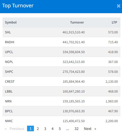 आज दिनभरिमा ३२० कम्पनीको १ करोड ७४ लाख २३ हजार ९४३ कित्ता शेयर किनबेच हुँदा ७ अर्ब ८ करोड रुपैयाँको शेयर कारोबार भएको छ । आज सबैभन्दा धेरै सोल्टी होटलको शेयर कारोबार भएको छ । आज यस कम्पनीको ४६ करोड १९ लाख रुपैयाँको शेयर कारोबार भएको छ । राधि विद्युत कम्पनीको ४४ करोड १७ लाख रुपैयाँको शेयर कारोबार भएको छ । युनिभर्सल पावरको ३३ करोड ४५ लाख रुपैयाँको शेयर कारोबार भएको छ । ङादी ग्रुप पावरको ३२ करोड ३६ लाख रुपैयाँको शेयर कारोबार भएको छ ।