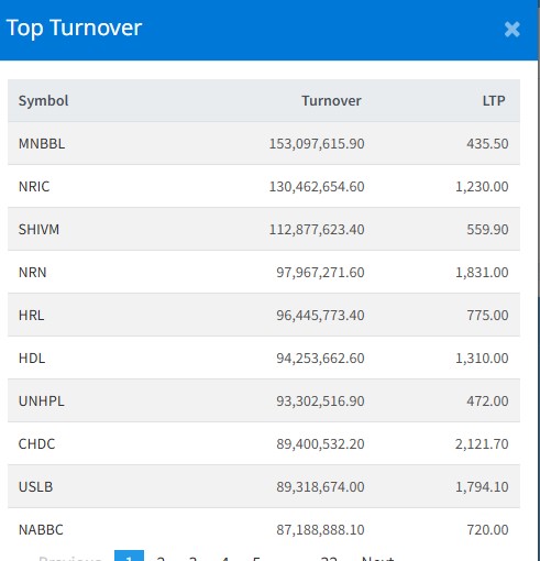 आज दिनभरिमा ३११ कम्पनीको ७६ लाख ४३ हजार ६३५ कित्ता शेयर किनकबेच हुँदा ३ अर्ब २७ करोडको शेयर कारोबार भएको छ । आज सबैभन्दा धेरै मुक्तिनाथ विकास बैंकको शेयर कारोबार भएको छ । आज यस बैंकको १५ करोड ३० लाख रुपैयाँको शेयर कारोबार भएको छ । नेपाल पुनर्बीमा कम्पनीको १३ करोड ४ लाख रुपैयाँको शेयर कारोबार भएको छ । शिवम् सिमेन्टको ११ करोड २८ लाख रुपैयाँको शेयर कारोबार भएको छ ।