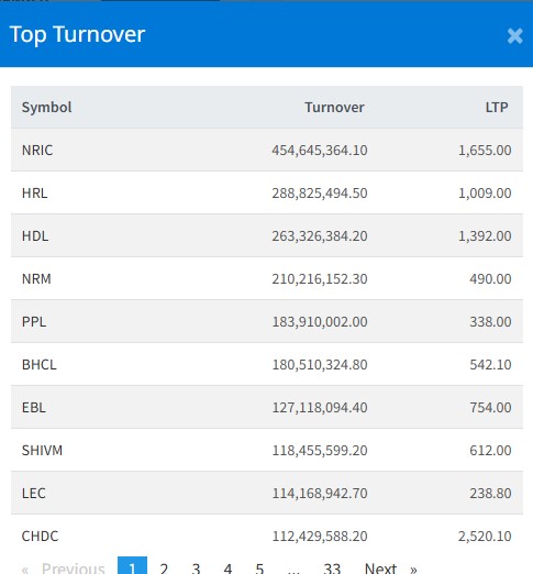 आज ६ अर्ब ६ करोड माथिको शेयर कारोबार हुँदा सबैभन्दा धेरै नेपाल पुनर्बीमा कम्पनीको शेयर कारोबार भएको छ । आज यस कम्पनीको ४५ करोड ४६ लाख रुपैयाँको शेयर कारोबार भएको छ । हिमालयन रिइन्स्योरेन्सको २८ करोड ८८ लाख रुपैयाँको शेयर कारोबार भएको छ । हिमालयन डिष्टिलरीको २६ करोड ३३ लाख रुपैयाँको शेयर कारोबार भएको छ । नेपाल रिपब्लिक मिडियाको २१ करोड २ लाख रुपैयाँको शेयर कारोबार भएको छ ।