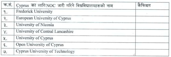 शिक्षा, विज्ञान तथा प्रविधिक मन्त्रालयले एक सूचना जारी गर्दै यसबारेमा जानकारी गराएको हो। नेपालबाट साइप्रसमा वैदेशिक अध्ययन गर्न जाने विद्यार्थीका लागि एनओसी पत्र प्रदान गर्ने सम्बन्धमा सम्बन्धित राजदूतावासबाट प्राप्त कूटनीतिक नोट र नेपाल राजदूतावास तेलअभिवको स्थलगत प्रतिवेदनका आधारमा ७ वटा विश्वविद्यालमा मात्रै एनओसी जारी गरिने मन्त्रालयले स्पष्ट पारेको छ।