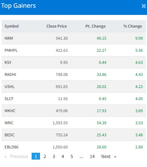 आज सबैभन्दा धेरै नेपाल रिपब्लिक मिडियाका लगानीकर्ताले कमाएका छन् । आज यस कम्पनीका लगानीकर्ताले ९ दशमलव ९९ प्रतिशतका दरले कमाएका हुन् । पञ्चकन्यामाई हाइड्रोका लगानीकर्ताले ५ दशमलव ५६ प्रतिशतका दरले कमाएका छन् । कुमारी सबल योजनाका इकाईधनीले ४ दशमलव ६३ प्रतिशतका दरले कमाएका छन् । राधि विद्युत कम्पनीका लगानीकर्ताले ४ दशमलव ४३ प्रतिशतका दरले कमाएका छन् ।