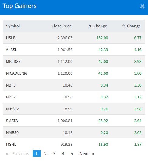 आज सबैभन्दा धेरै उन्नती सहकार्य लघुवित्त वित्तीय संस्थाका लगानीकर्ताले कमाएका छन् । आज यस कम्पनीका लगानकिर्ताले ६ दशमलव ७७ प्रतिशतका दरले कमाएका छन् । आशा लघुवित्तका लगानीकर्ताले ४ दशमलव १६ प्रतिशतका दरले कमाएका छन् । माछापुच्छ्रे डिबेञ्चर २०८७ का इकाईधनीले ३ दशमलव ९३ प्रतिशतका दरले कमाएका छन् ।
