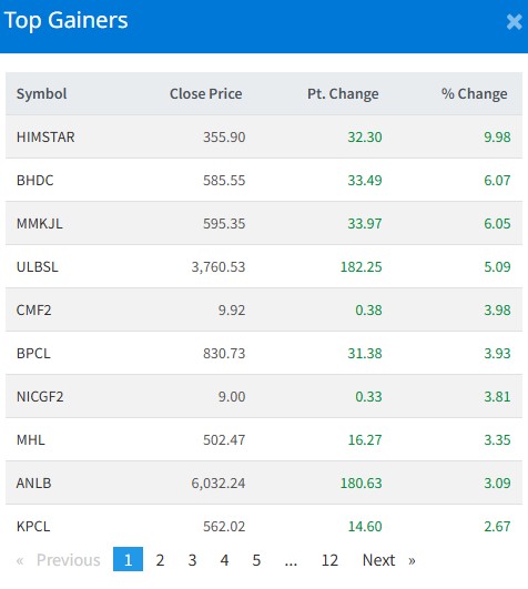 आज सबैभन्दा धेरै हिम स्टार ऊर्जाका लगानीकर्ताले कमाएका छन् । आज यसका लगानीकर्ताले ९ दशमलव ९८ प्रतिशतका दरले कमाएका हुन् । विन्ध्यावासीनी हाइड्रोपावरका लगानीकर्ताले ६ दशमलव ०७ प्रतिशतका दरले कमाएका छन् । माथिल्लो मैलुङ खोलाका लगानीकर्ताले ६ प्रतिशतका दरले कमाएका हुन् । उपकार लघुवित्तका लगानीकर्ताले ५ प्रतिशतका दरले कमाएका छन् ।