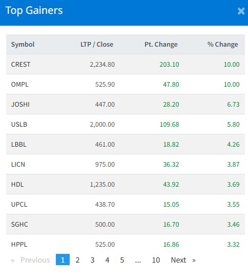 आज सबैभन्दा धेरै क्रेष्ट माइक्रो लाइफ र ओम मेगाश्रीका लगानीकर्ताले कमाएका छन् । आज यी दुई कम्पनीका लगानीकर्ताले १० प्रतिशतका दरले कमाएका हुन् । जोशी हाइड्रोपावरका लगानीकर्ताले ६ दशलमव ७३ प्रतिशतका दरले कमाएका छन् । उन्नती सहकार्य लघुवित्तका लगानीकर्ताले ५ प्रतिशतका दरले कमाएका छन् ।