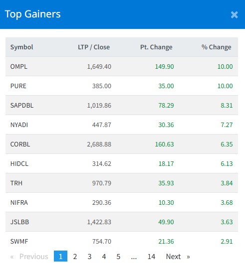 आज सबैभन्दा धेरै ओम मेगाश्री र पियोर इनर्जीका लगानीकर्ताले कमाएका छन् । आज यी दुई कम्पनीका लगानीकर्ताले १० प्रतिशतका दरले कमाएका छन् । न्यादी हाइड्रोपावरका लगानीकर्ताले ८ दशलमव ७२ प्रतिशतका दरले कमाएका छन् । एचआइडीसीएलका लगानीकर्ताले ६ दशलमव ५९ प्रतिशतका दरले कमाएका हुन् ।