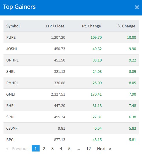 आज सबैभन्दा धेरै पियोर इनर्जी कम्पनीका लगानीकर्ताले कमाएका छन् । आज यस कम्पनीका लगानीकर्ताले १० प्रतिशतका दरले कमाएका छन् । जोशी हाइड्रोपावरका लगानीकर्ताले ९ दशमलव ९० प्रतिशतका दरले कमाएका छन् । युनियन हाइड्रोपावरका लगानीकर्ताले ९ दशमलव २२ प्रतिशतका दरले कमाएका छन् । सिंगटी हाइड्रोका लगानीकर्ताले ८ प्रतिशतका दरले कमाएका हुन् ।