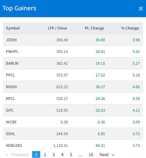 आज सबैभन्दा धेरै जोशी हाइड्रोपावर कम्पनीका लगानीकर्ताले कमाएका छन् । आज यस कम्पनीका लगानीकर्ताले ९ दशमलव ९८ प्रतिशतका दरले कमाएका हुन् । पञ्चकन्या माइ हाइड्रोपावरका लगानीकर्ताले ९ दशमलव ४२ प्रतिशतका दरले कमाएका छन् । बरुण हाइड्रोपावरका लगानीकर्ताले ५ दशमलव २७ प्रतिशतका दरले कमाएका छन् । पाँचथर पावरका लगानीकर्ताले ५ प्रतिशतका दरले कमाएका छन् ।