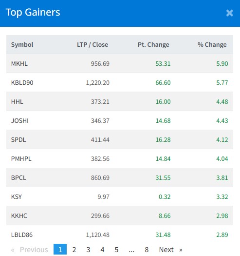 आज सबैभन्दा धेरै माइखोला हाइड्रोपावरका लगानीकर्ताले कमाएका छन् । आज यस कम्पनीका लगानीकर्ताले ५ दशमलव ९० प्रतिशतका दरले कमाएका छन् । केबिएल डिबेञ्चरका इकाईधनीले ५ दशमलव ७७ प्रतिशतका दरले कमाएका छन् । हिमालयन हाइड्रोपावरका लगानकिर्ताले ४ दशमलव ४८ प्रतिशतका दरले कमाएका छन् । जोशी हाइड्रोपावरका लगानीकर्ताले ४ दशमलव ४३ प्रतिशतका दरले कमाएका छन् ।