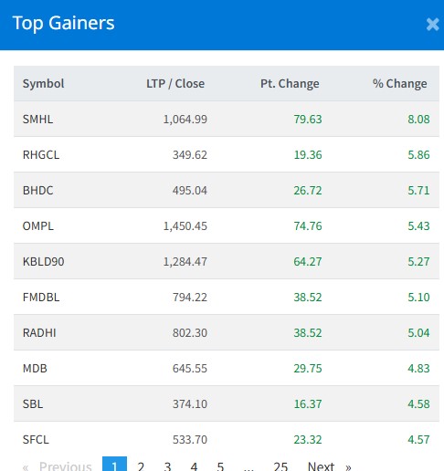 आज सबैभन्दा धेरै सुपर मादी हाइड्रोपावरका लगानीकर्ताले कमाएका छन् । आज यस कम्पनीका लगानीकर्ताले ८ दशमलव ०८ प्रतिशतका दरले कमाएका हुन् । राप्ती हाइड्रो एन्ड जनरलका लगानीकर्ताले ५ दशमलव ८६ प्रतिशतका दरले कमाएका छन् । विन्ध्यावासीनी हाइड्रोका लगानीकर्ताले ५ दशमलव ७१ प्रतिशतका दरले कमाएका छन् । ओम मेगाश्रीका लगानकिर्ताले ५ दशमलव ४३ प्रतिशतका दरले कमाएका हुन् ।