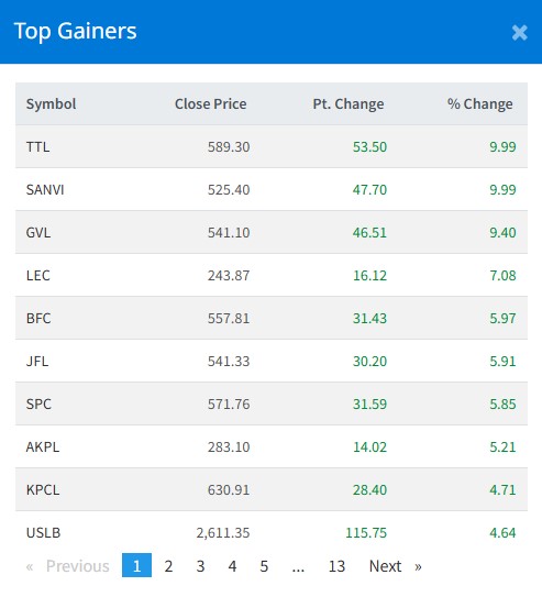 आज सबैभन्दा धेरै ट्रेड टावर कम्पनी र सान्भी इनर्जीका लगानीकर्ताले कमाएका छन् । आज यी कम्पनीका लगानीकर्ताले ९ दशमलव ९९ प्रतिशतका दरले कमाएका हुन् । ग्रिन भेञ्चरका लगानीकर्ताले ९ दशमलव ४० प्रतिशतका दरले कमाएका छन् । लिबर्टी इनर्जीका लगानीकर्ताले ७ प्रतिशतका दरले कमाएका छन् ।