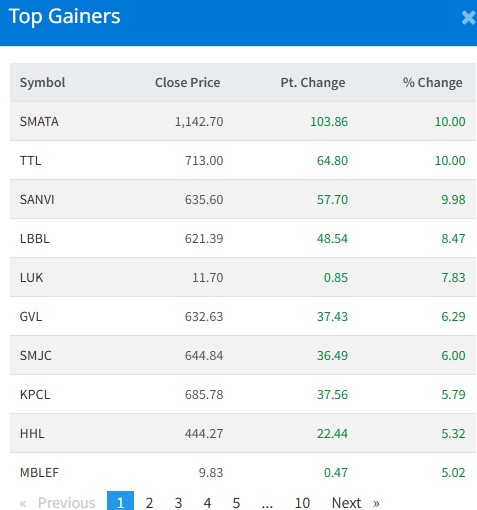 आज सबैभन्दा धेरै समता घरेलु लघुवित्त वित्तीय संस्था र ट्रेड टावरका लगानीकर्ताले कमाएका छन् । आज यी दुई कम्पनीका लगानीकर्ताले १० प्रतिशतका दरले कमाएका हुन् । सान्भी इनर्जीका लगानीकर्ताले ९ दशमलव ९८ प्रतिशतका दरले कमाएका छन् । लुम्बिनी विकास बैंकका लगानीकर्ताले ८ दशमलव ४७ प्रतिशतका दरले कमाएका छन् ।