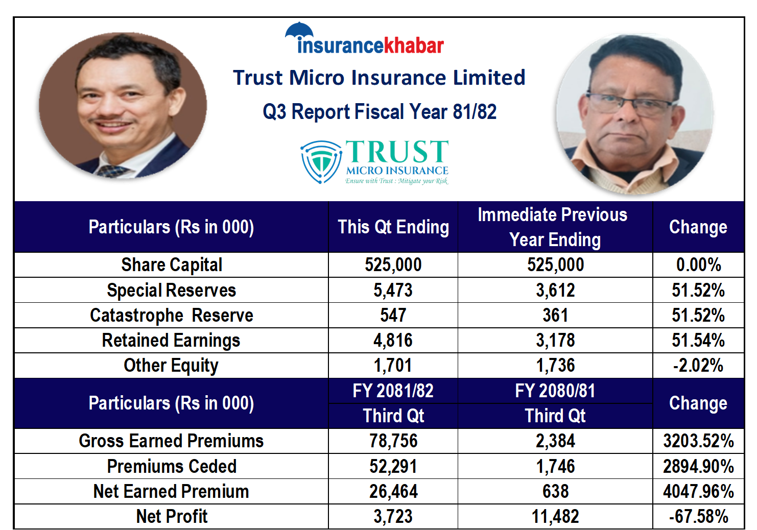 काठमाडौं । ट्रष्ट माइक्रो इन्स्योरेन्सले आर्थिक वर्ष २०८१ /८२ को तेस्रो त्रैमासको अपरिष्कृत वित्तीय विवरण प्रकाशन गरेको छ । कम्पनीले प्रकाशन गरेको वित्तीय विवरण अनुसार कम्पनीको नाफा बोहक अधिकांश सूचक बढेको छ ।