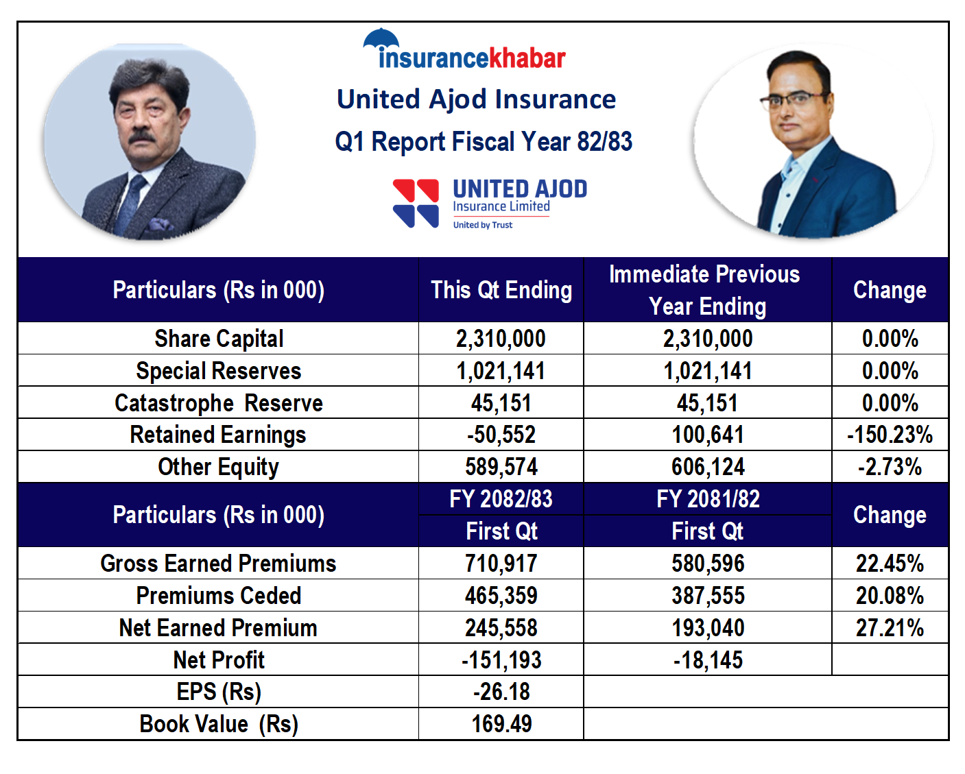 काठमाडौं । युनाइटेड अजोड इन्स्योरेन्सले गत आर्थिक वर्ष २०८२।८३ को प्रथम त्रैमास (साउन–असोज)को अपरिष्कृत वित्तीय विवरण सार्वजनिक गरेको छ।