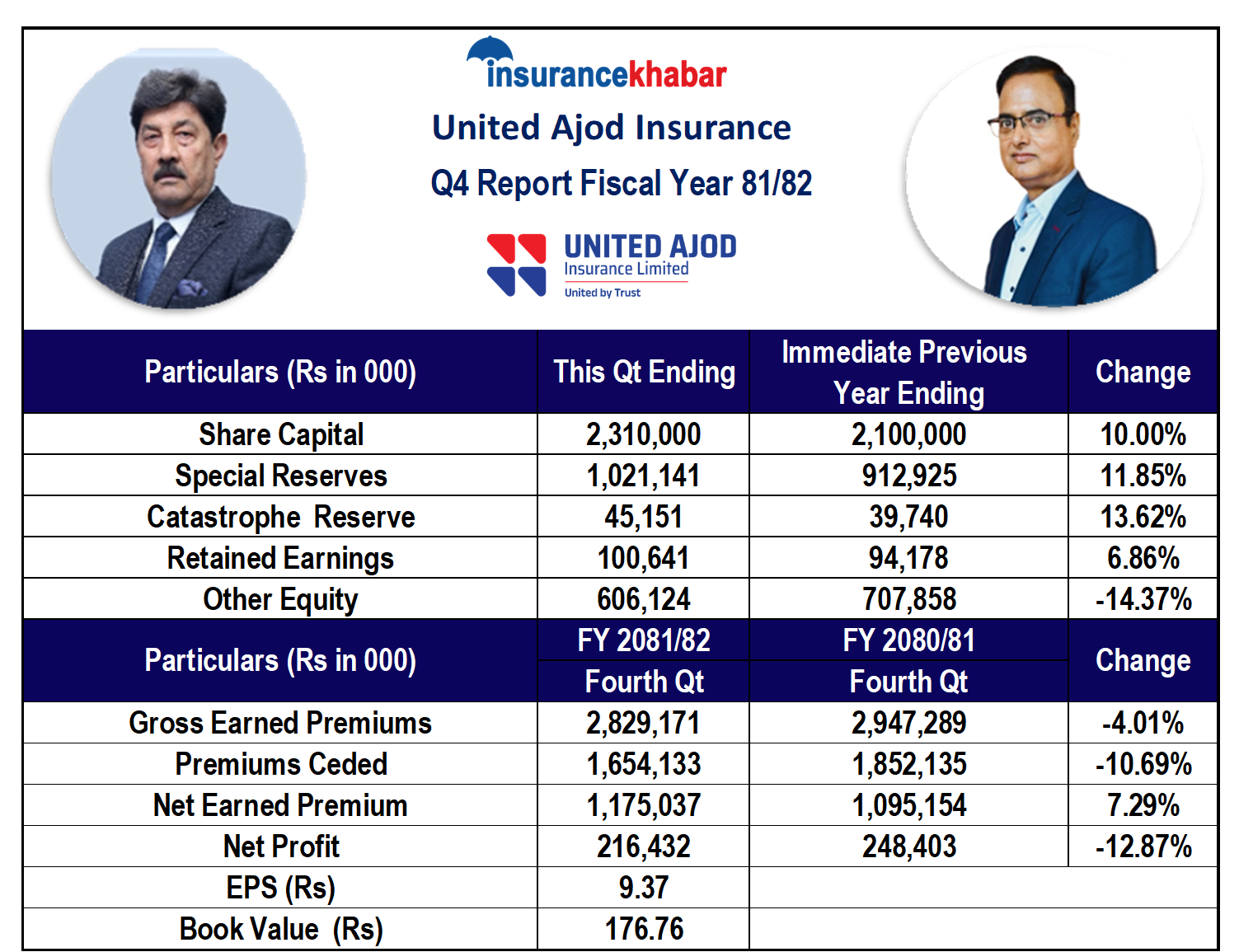 काठमाडौं । यूनाइटेड अजोड इन्स्योरेन्स कम्पनीले गत आर्थिक वर्ष २०८१ /८२ को चौथोे त्रैमासम्मको अपरिष्कृत वित्तीय विवरण सार्वजनिक गरेको छ । समीक्षा अवधिमा कम्पनीको नाफा र कुलबीमा शुल्क घटेको छ ।