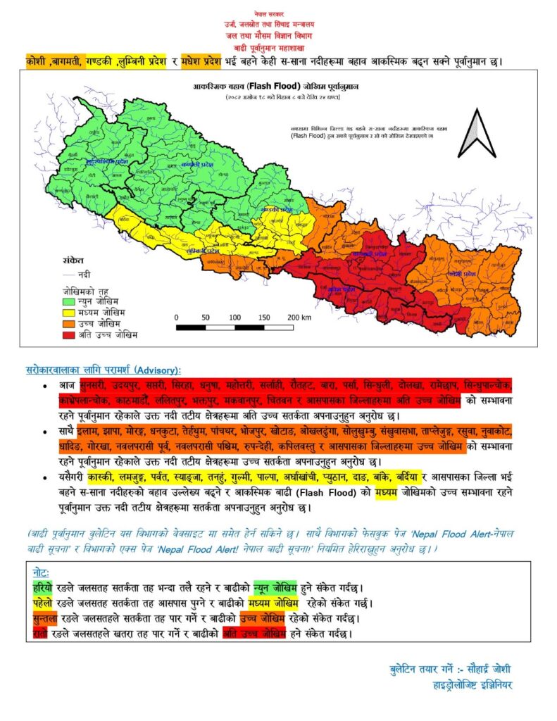 बागमती प्रदेश र मधेश प्रदेश भएर बहने प्राय सवै नदी नाला सतर्कता तह नजिक र बढ्दोछ। शनिबार सांझ र राती जोखिम थप बढ्ने संभावना छ।
