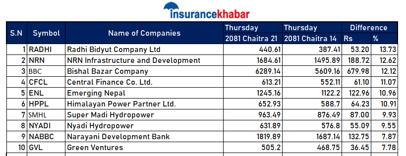 त्यस्तै दोस्रोमा एनआरएन इन्फ्रास्टक्चर एन्ड डेभलपमेन्टको शेयरमूल्य १२.६२ प्रतिशतले वृद्धि भएको छ। गत साता १४९५.८९ रुपैयाँमा बन्द भएको कम्पनीको बजारमूल्य यो साता १६८४.६१ रुपैयाँमा बन्द भएको छ। यो साता कम्पनीको बजारमूल्य प्रतिकित्ता १८८.७२ले बढेको छ।