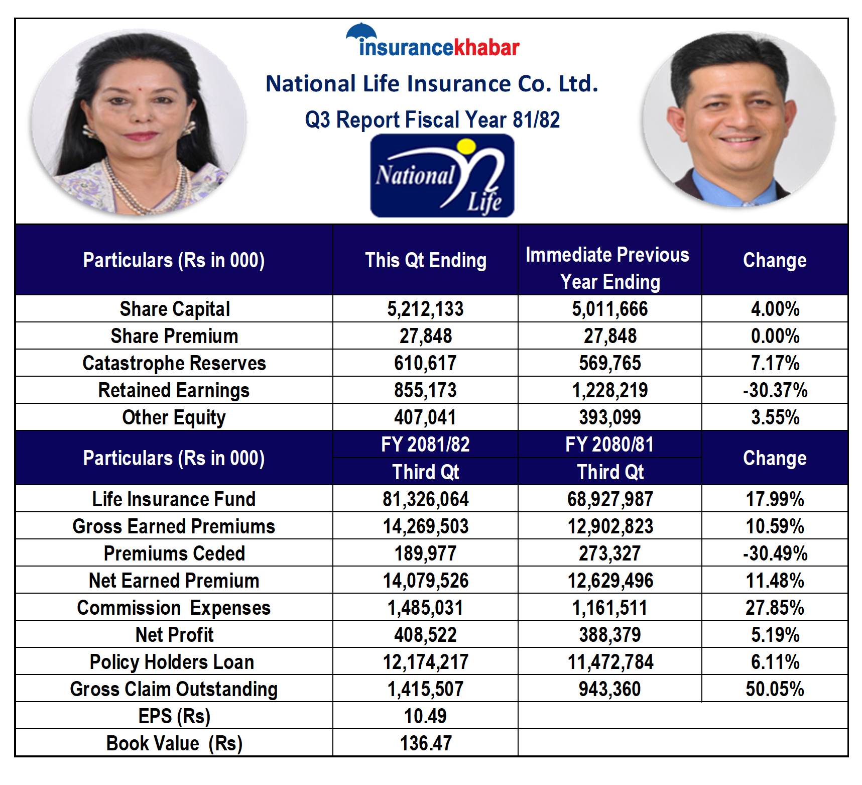 कम्पनीले समीक्षा अवधिसम्म १४ अर्ब ७ करोड ९५ लाख रुपैयाँ खुद बीमाशुल्क आर्जन गरेको छ। अघिल्लो आर्थिक वर्षको सोही अवधिसम्म कम्पनीले १२ अर्ब ६२ करोड ९४ लाख रुपैयाँ खुद बीमाशुल्क आर्जन गरेको थियो। अघिल्लो वर्षको तुलनामा कम्पनीको खुद बीमाशुल्क आर्जन ११.४८ प्रतिशतले बढेको छ।
