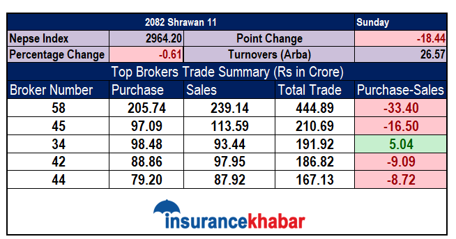 २६ अर्ब ५७ करोड कारोबार भएको दिन ब्रोकर नम्बर ५८ बाट सर्वाधिक रकमको कारोबार भएको छ ।