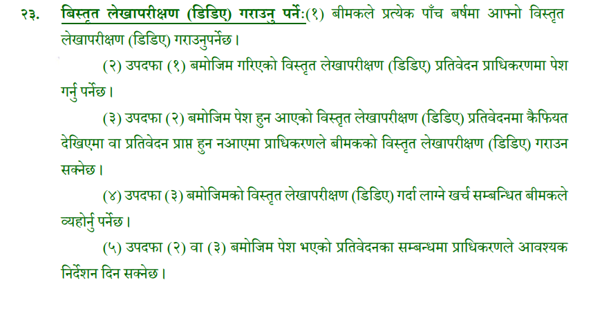 २०६६ साल अघि र २०७४ सालमा इजाजत पाएर सञ्चालनमा आएका सबै जीवन र निर्जीवन बीमकको लागि विस्तृत लेखापरीक्षण अनिवार्य भइसकेको अवस्था छ।