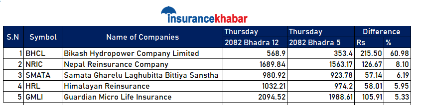 त्यस्तै दोश्रोमा नेपाल पुनर्बीमाको शेयर मूल्य ८.१० प्रतिशतले वृद्धि भएको छ । गत साता १५६३.१७ रुपैयाँमा बन्द भएको कम्पनीको बजार मूल्य यो साता १६८९.८४ रुपैयाँमा बजार मूल्य बन्द भएको छ । यो साता कम्पनीको बजार मूल्य प्रति कित्ता १२६.६७ले बढेको छ ।