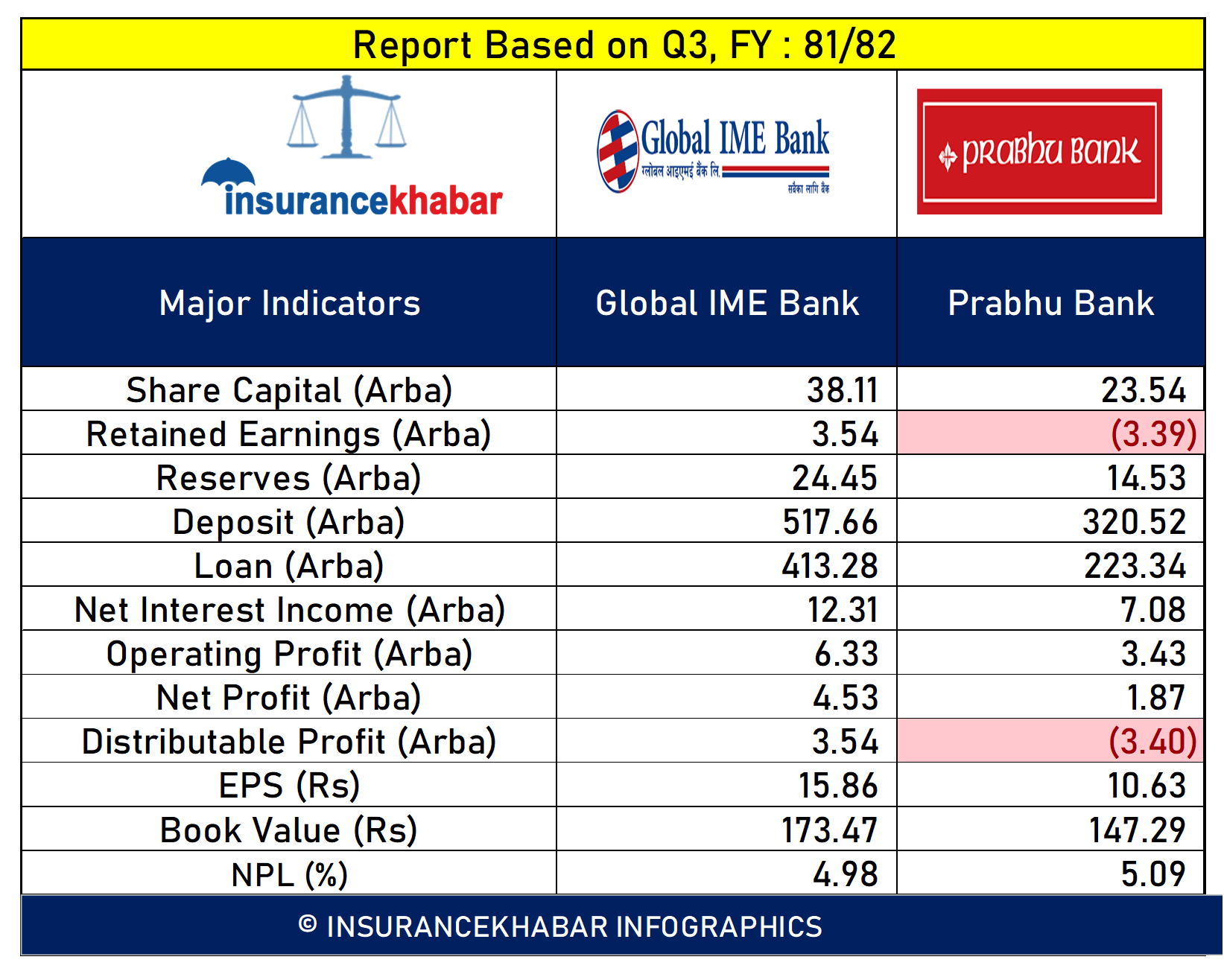 रिटेन्ड अर्निङः ग्लोबल आइएमईको रिटेन्ड अर्निङमा ३ अर्ब ५४ करोड रहेको छ भने प्रभुको रिटेन्ड अर्निङ ३ अर्ब ३९ करोड ऋणात्मक रहेको छ।